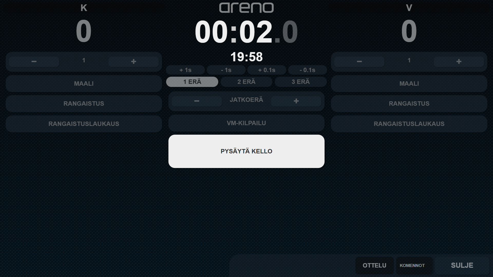 Arenon ohjausnäkymä on suunniteltu niin, että toimitsija oppii käytön muutamassa minuutissa. Kaikki keskeiset toiminnot, kuten ajan käynnistys/pysäytys, pisteiden lisäys ja jäähyjen syöttö, löytyvät yhdellä vilkaisulla. Selkeät painikkeet ja looginen layout tekevät ohjelmistosta luotettavan myös kiireisissä pelitilanteissa.